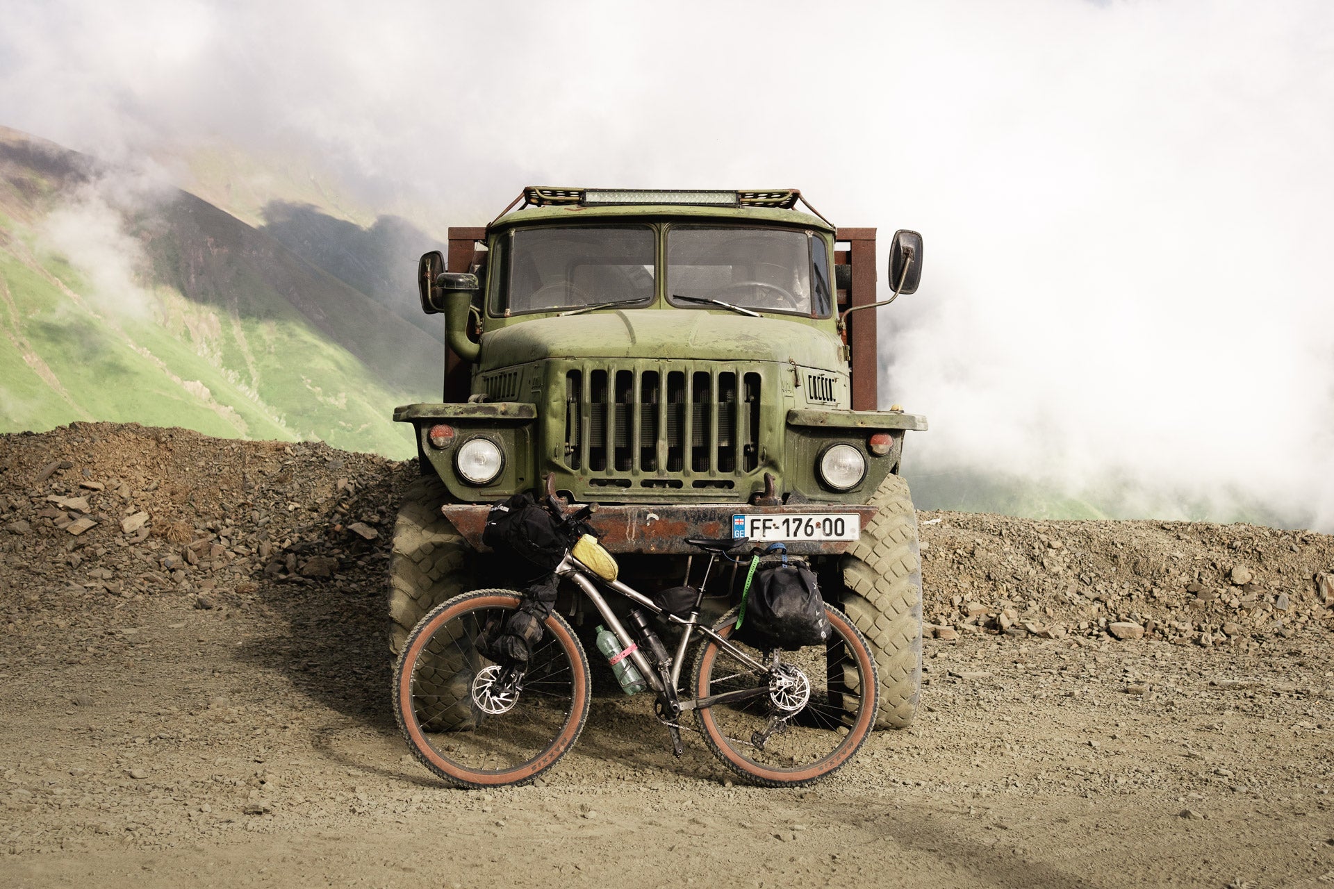 Nous nous sommes inspirés de l’itinéraire Caucasus Crossing de BIKEPACKING.com et l’avons adapté afin d’aller explorer davantage les montagnes et les vallées perdues. Dans la région, le dénivelé n’est pas à prendre à la légère! Les montagnes sont hautes, certes, mais c’est surtout la manière dont les routes ont été développées -ou leur absence de développement- qui représente un défi : dans ces régions, les déplacements se faisaient historiquement à cheval ou à pied, et en dehors des routes principales qui se trouvent dans le creux des vallées, il y a peu d’alternatives pour gravir les cols. Bien souvent, l’option est une single track abrupte, qui est en fait un sentier utilisé par les bergers et les randonneurs, impliquant parfois de devoir pousser son vélo sur 2 jours. C’est notamment ce que nous avons fait en Tusheti pour passer le célèbre Atsunta Pass situé à 3510 mètres d’altitude. Les infrastructures routières sont cependant en plein développement depuis quelques années, ce qui laisse à penser que la majorité des chemins de gravel que nous avons empruntés seront asphaltés d’ici 5 ou 10 ans.