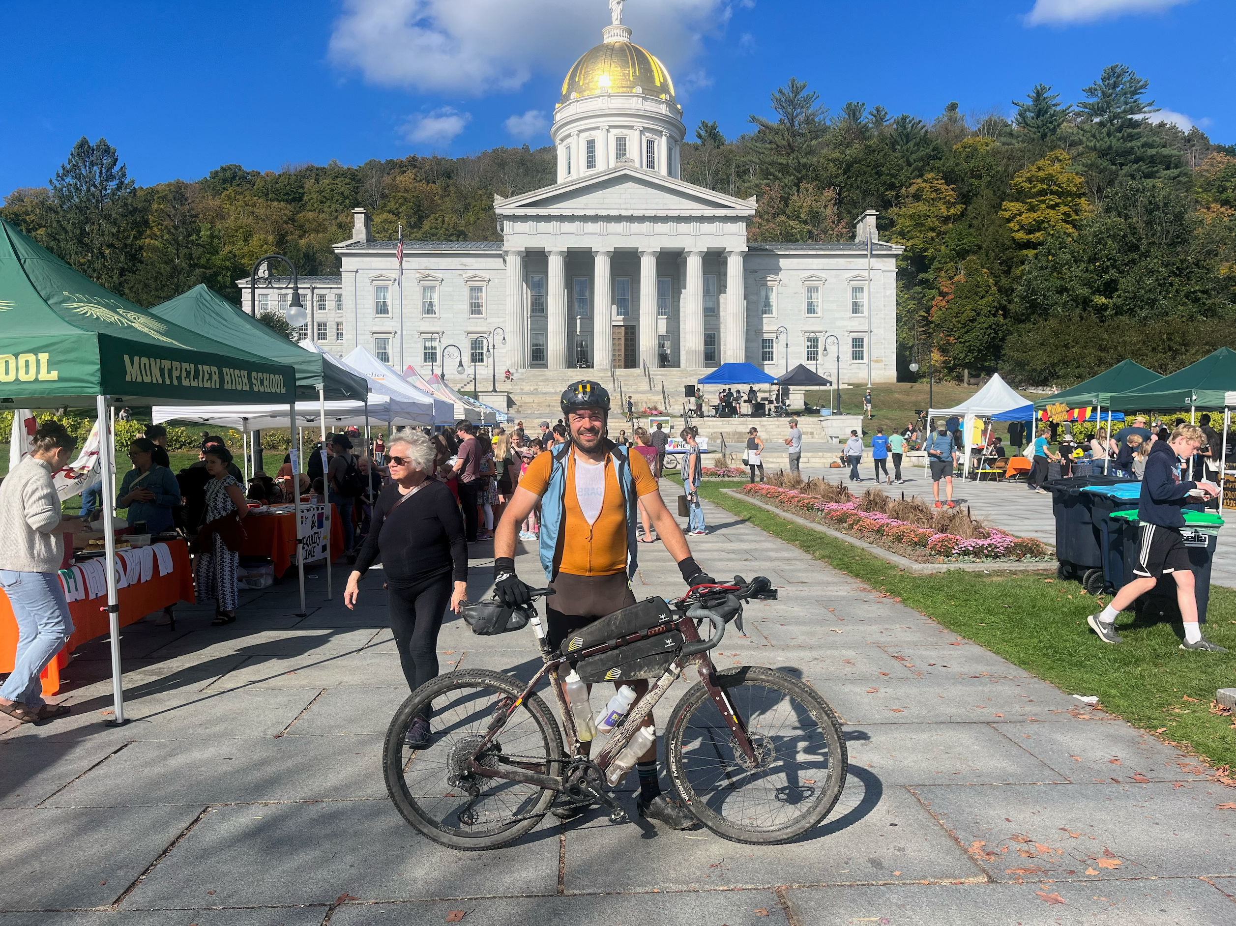 Le Grand Départ du @vermontbikepackers Super 8 à 8h du matin, le 27 septembre 2024, devant le Capitole à Montpelier, VT. J'étais prêt pour la moitié nord, qui totalise 442 km de gravier peu roulant avec 8 400 m de montées raides. Ayant acheté un appartement pendant l'été et maintenant confronté à toutes les choses qu'un propriétaire doit gérer, cette saison ne m'a pas laissé beaucoup de temps pour me préparer aux événements cyclistes. Cependant, j'avais testé ma configuration de vélo pour le Vermont Super 8 avec le Katahdin de Panorama Cycles depuis le début de l'été.